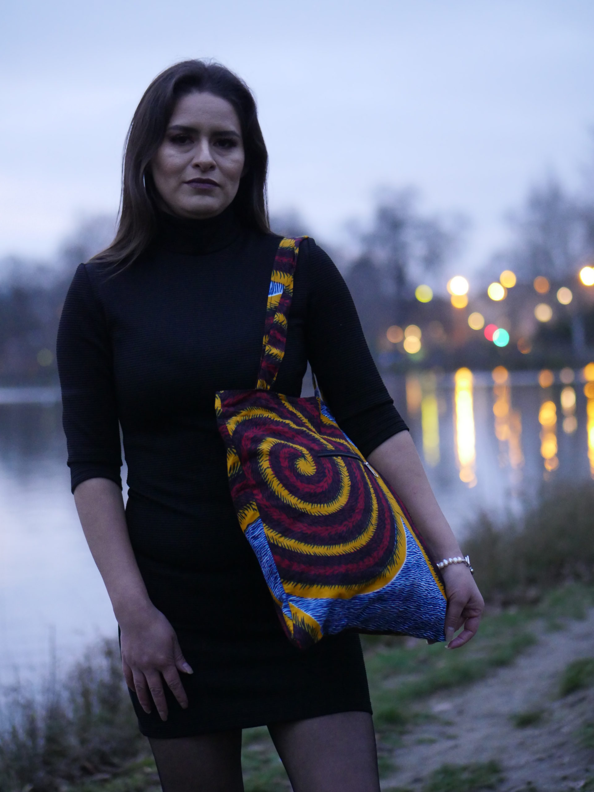 Imprimé wax, finition doublé à l’intérieur en tissu noir, 2 poche l’intérieur, et 1 fermetures éclair.